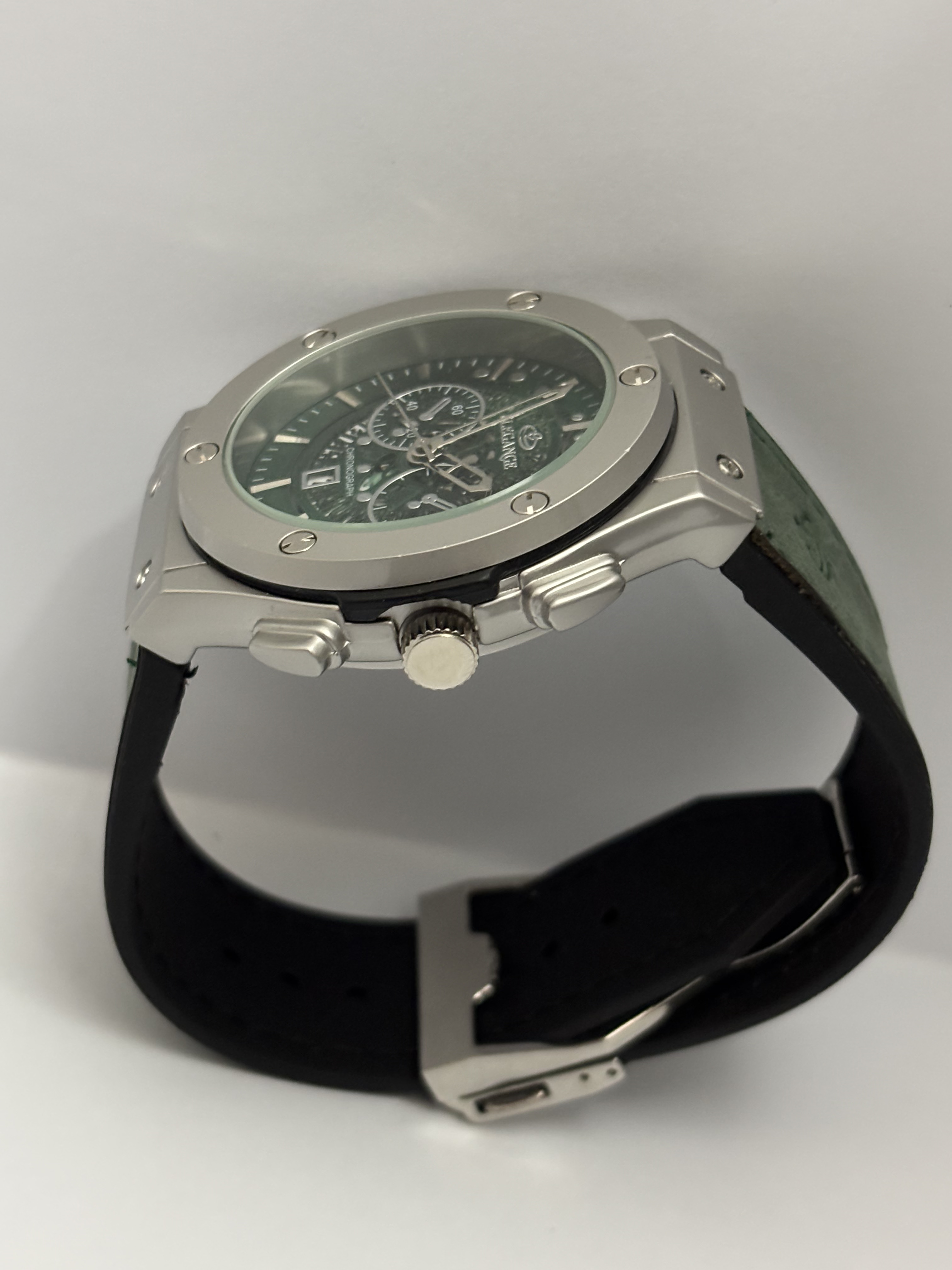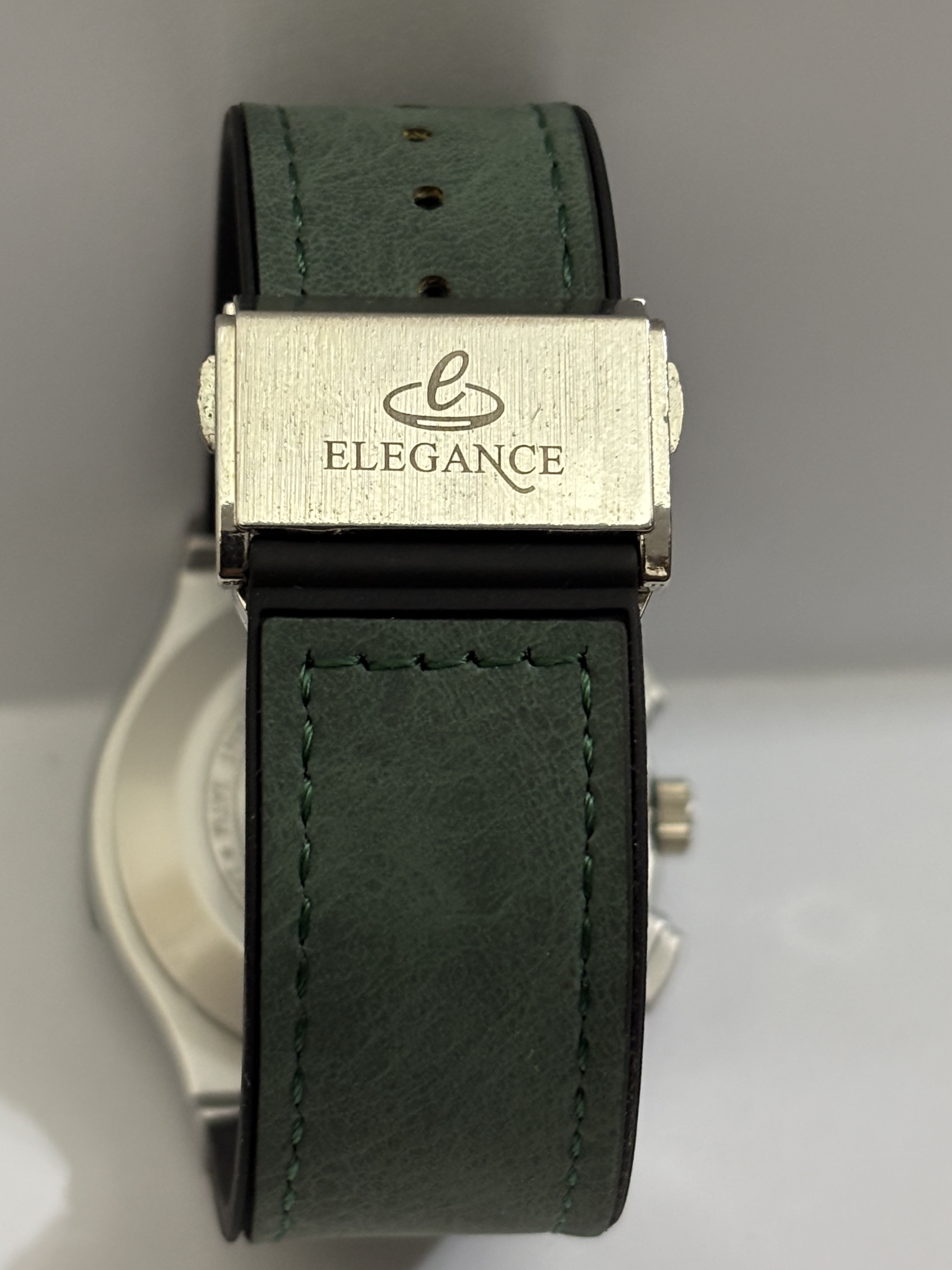 Elegance chronograph with steel case, green leather strap, skeleton dial.