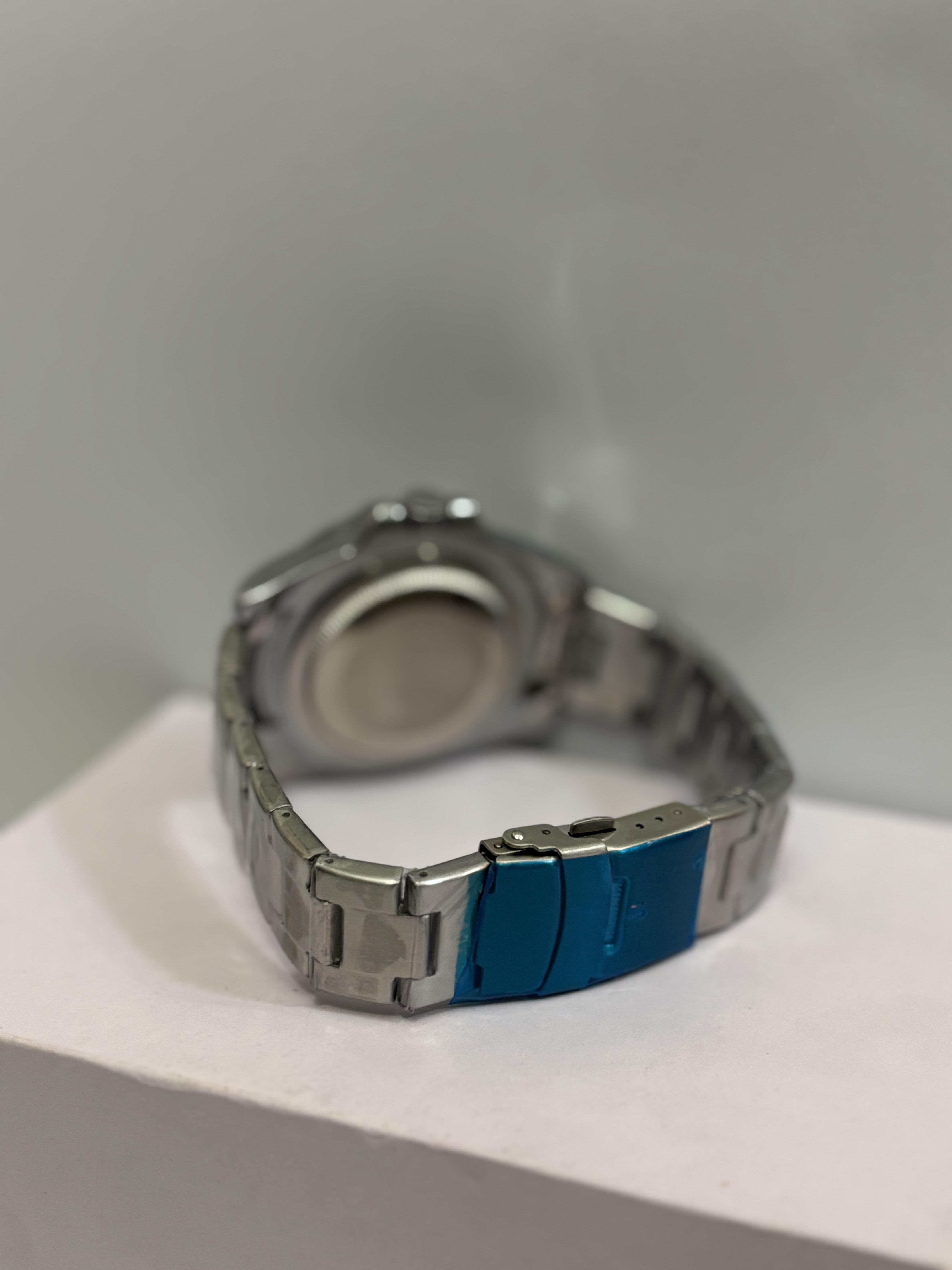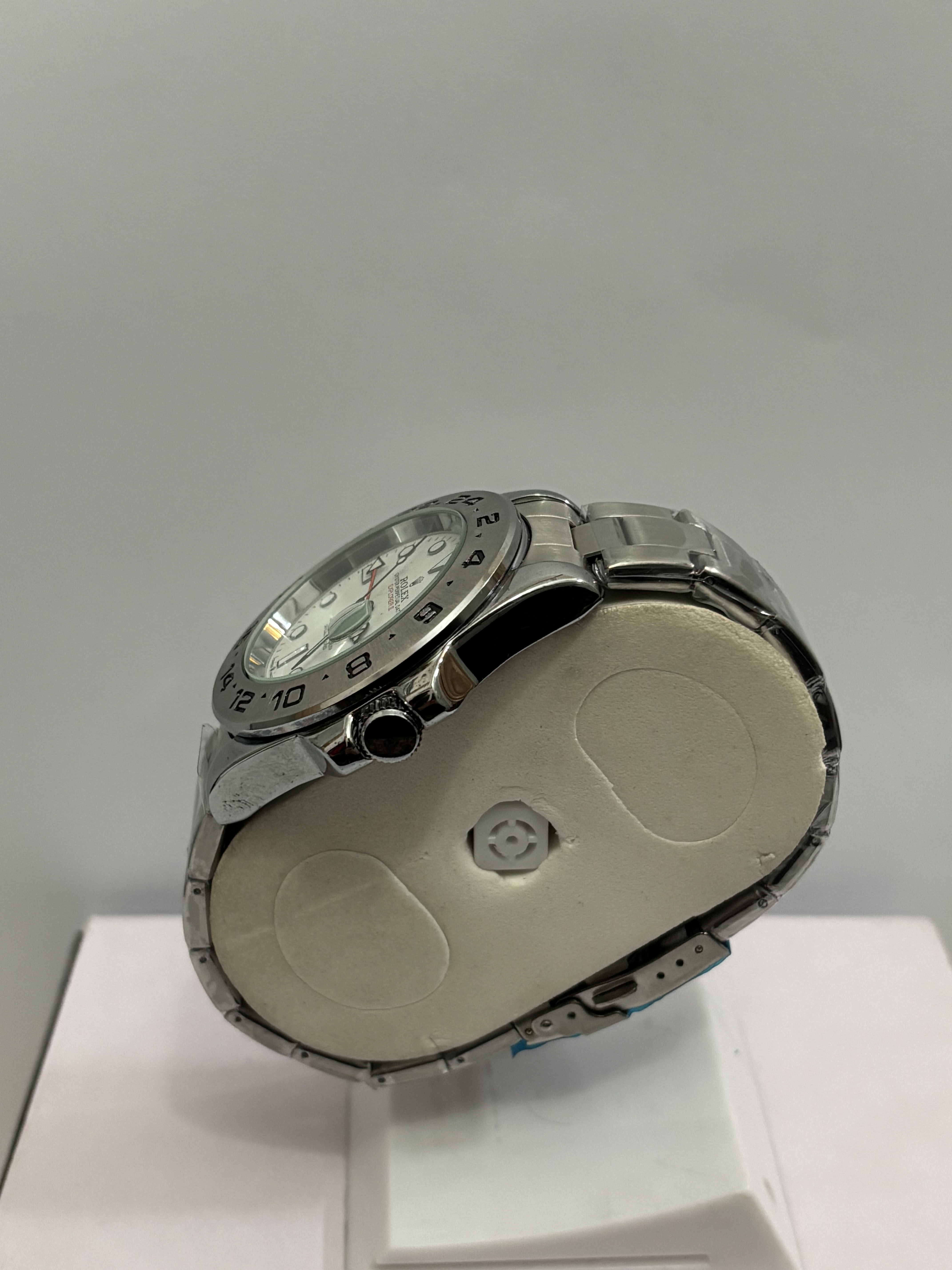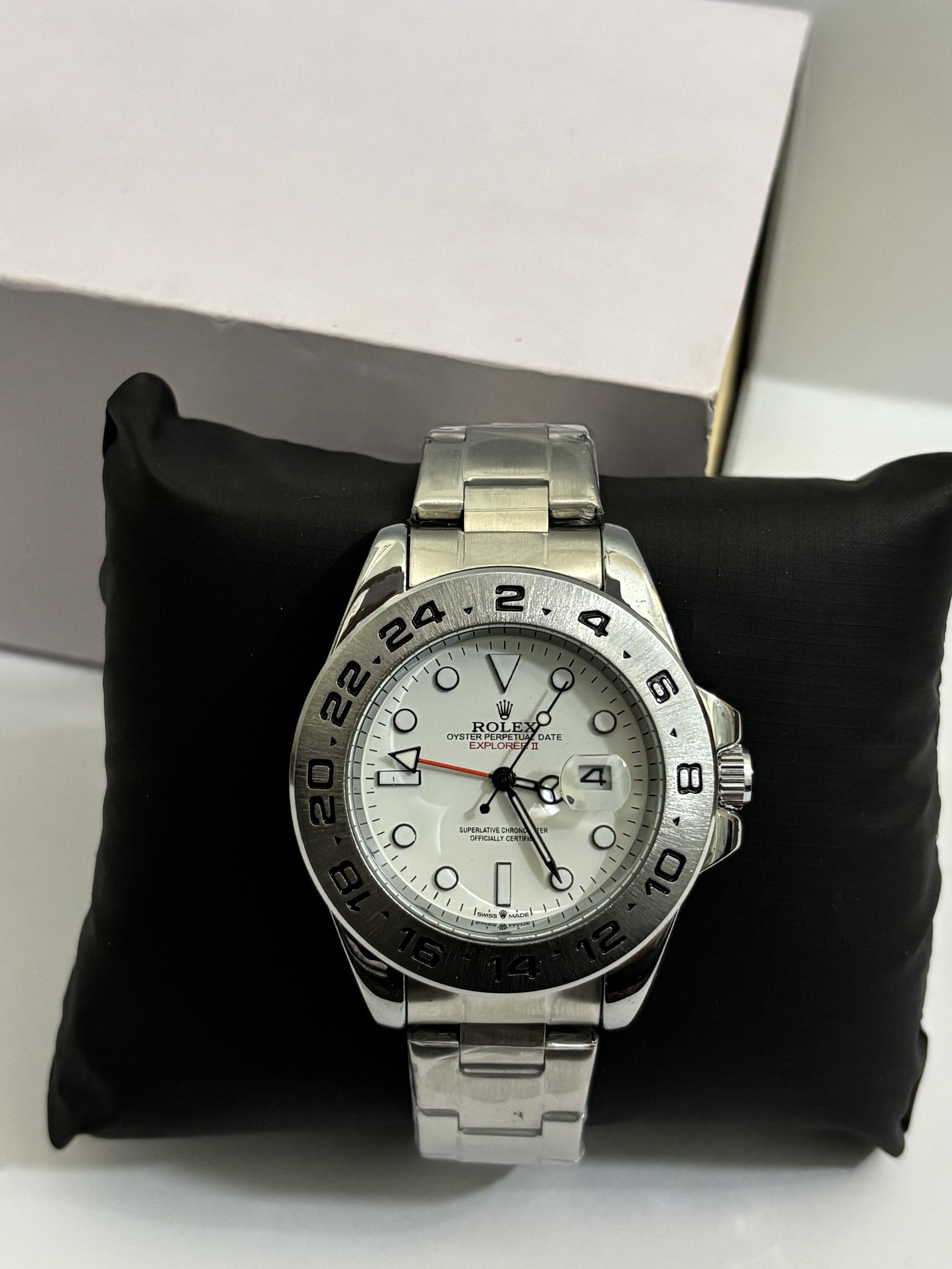 Rolex Explorer II stainless steel watch with white dial, GMT hand.
