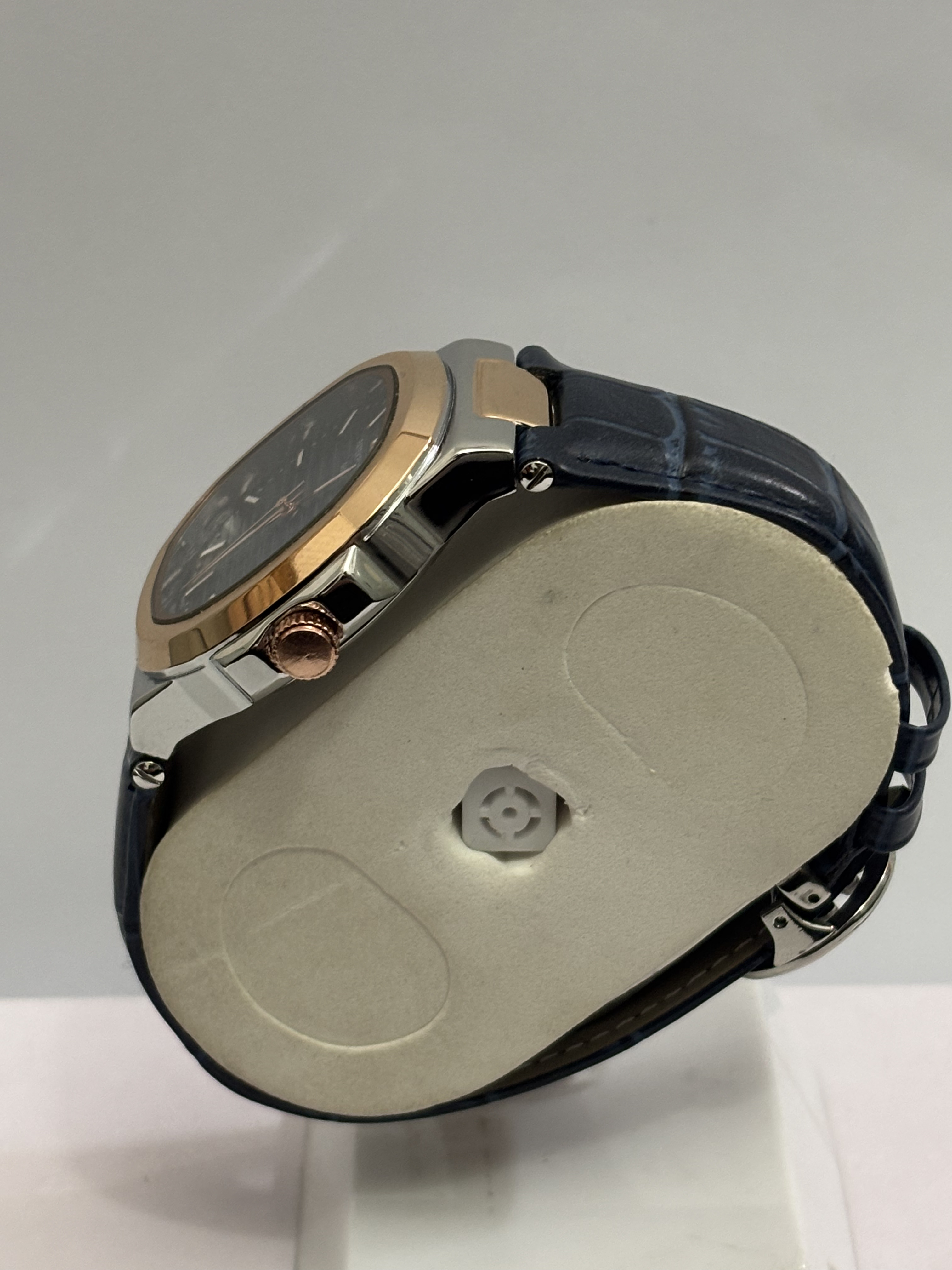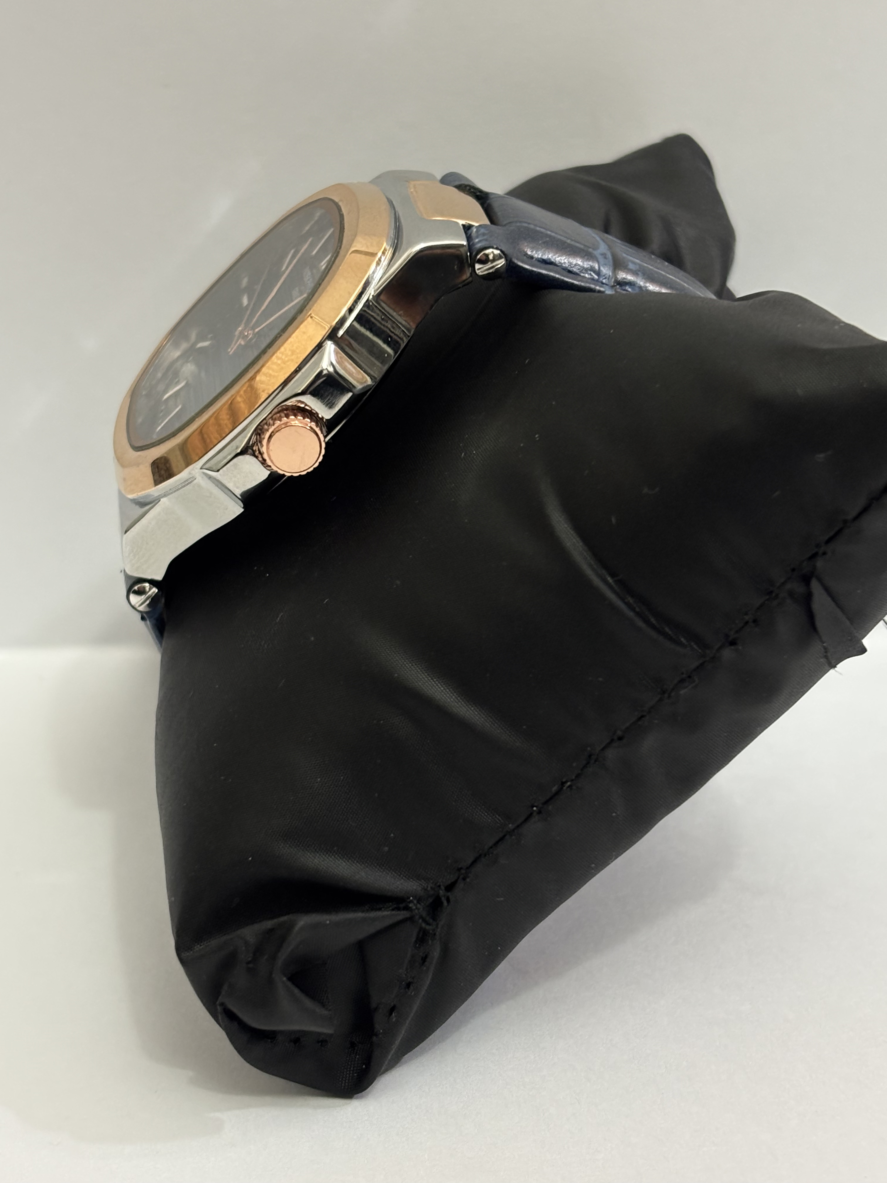 Patek Philippe Nautilus, two-tone case, blue leather strap, blue dial.